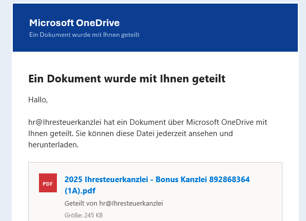 Ich werden von der Kanzlei NIEMALS einen Link über Microsoft OneDrive versenden oder freigeben. Dateien werden entweder über die DATEV Kommunikation oder das Mandantensystem bereitgestellt. In Ausnahmefällen wird auch ein Link zu einem einmaligen Abruf versandt.